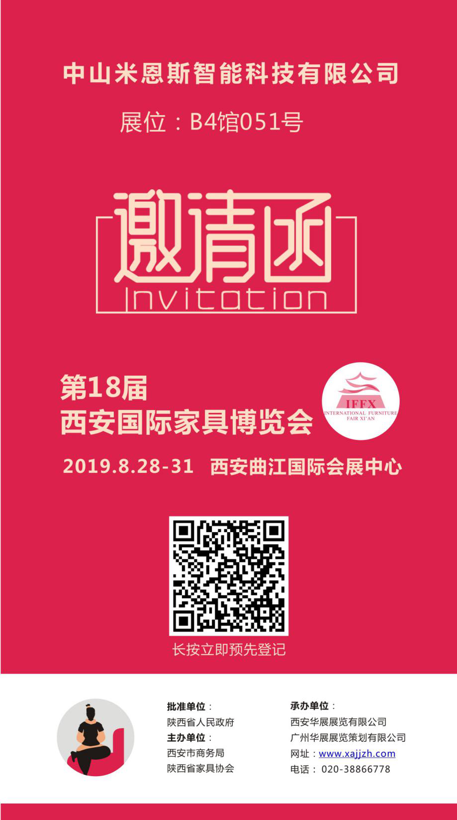 2019年8月28—31日,第十八屆西安國際家具博覽會觀眾預登記現已開通,趕快關注“西安家具博覽會”微信公眾號或點擊上方二維碼進行預報名吧,預報名成功后,將可享受免排隊、免門票,快速入場的福利,期待與您相遇。